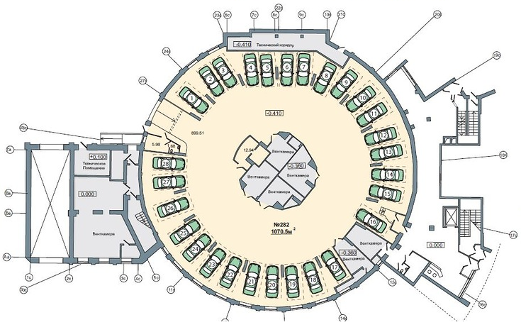 Первый этаж бизнес-центра представляет собой паркинг на 28 машиномест и помещения инженерного обеспечения.